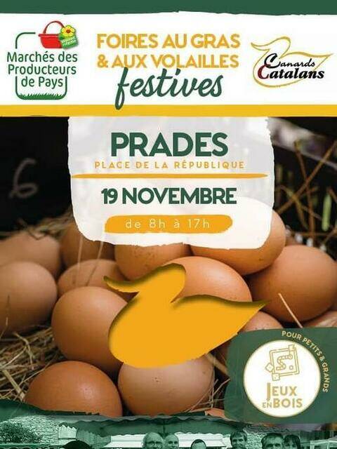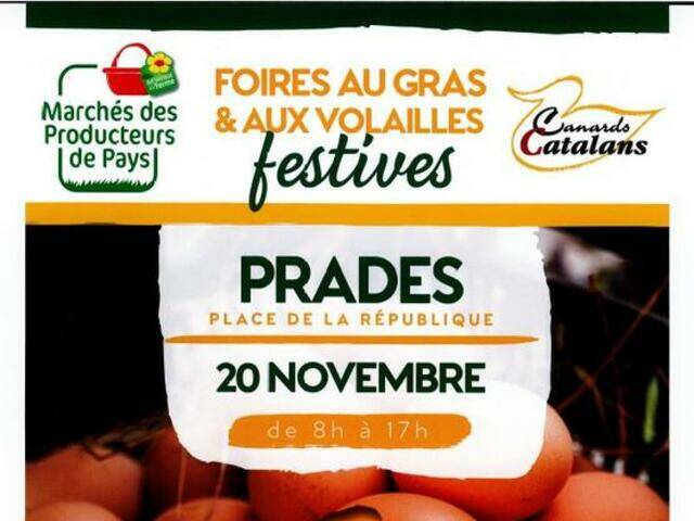 A l'approche des fêtes de fin d'année, la foire au Gras de Prades vous propose de découvrir les produits de grande qualité, y sera présenté le canard sous toutes ses formes (foie gras, rillettes, confits, plats cuisinés...) mais aussi des volailles labellisées.Des saveurs locales à goûter, faire découvrir et partager et de belles idées cadeaux pour Noël sur ce beau marché terroir.