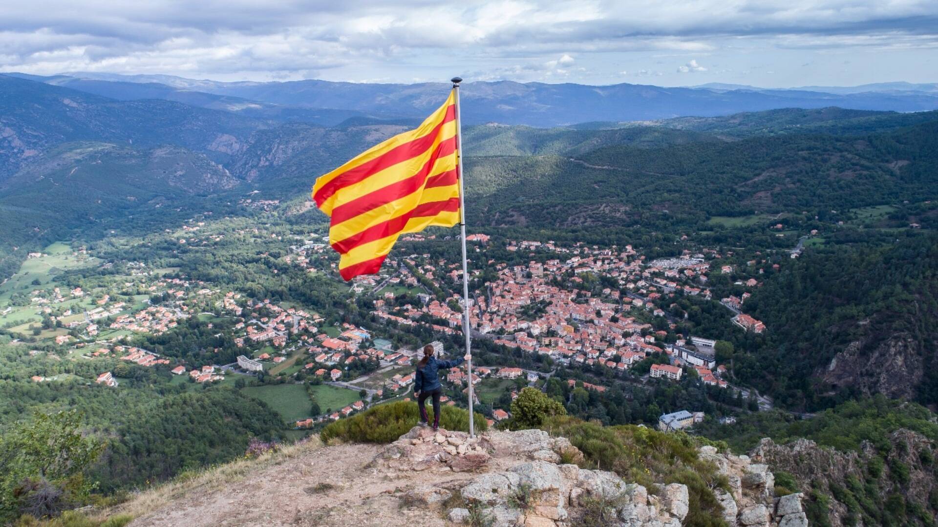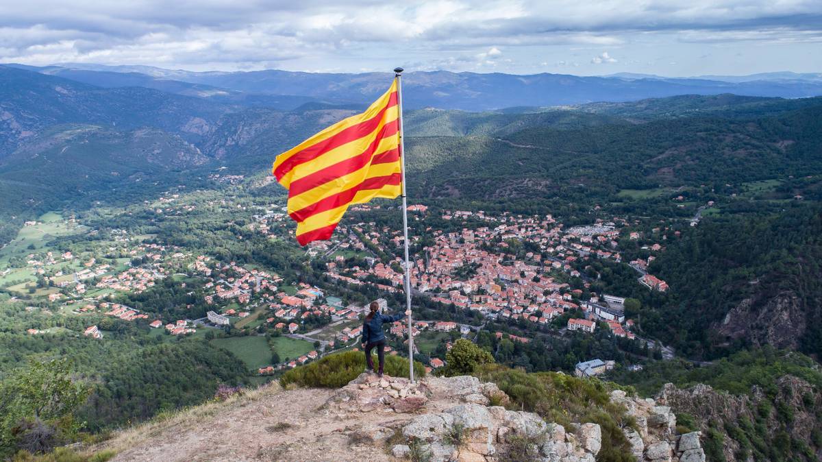 Une fois lancé sur le sentier, c’est une montée assez rude qui nous attend. Mais je vous rassure, ca sera la plus difficile de la randonnée. Heureusement, plus on prend de la hauteur, plus on découvre une vue magnifique sur Vernet-les-Bains. De quoi nous apporter un peu de réconfort. Après quelques beaux clichés en poche, on arrive devant cet immense drapeau catalan. Ca y est nous sommes bien au Pic de la Pena. Un paysage époustouflant qui nous fait bien vite oublier nos cuisseaux douloureux. Ils sont déjà aux placards. Comme par magie, on ne ressent plus rien, juste le bonheur qui plane autour de nous. On est fier de pouvoir contempler tout ça de nos propres yeux. Le drone aussi se régale et immortalise ce moment en vidéo.