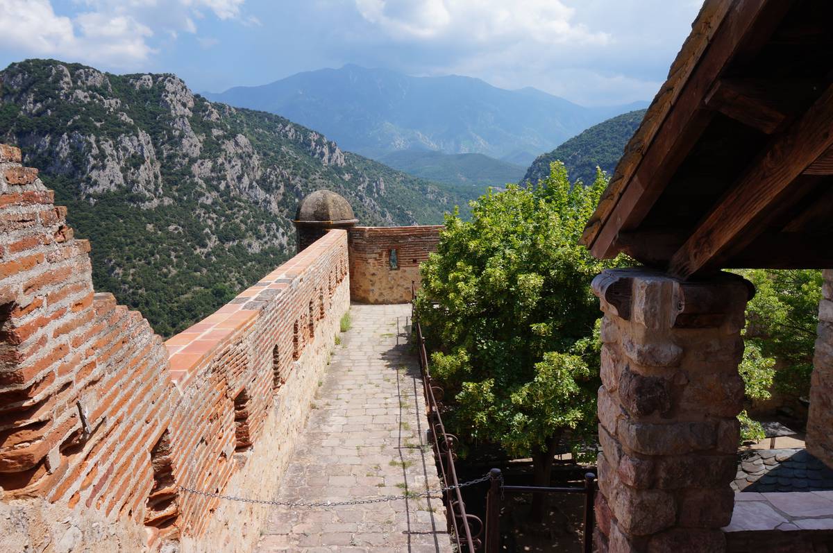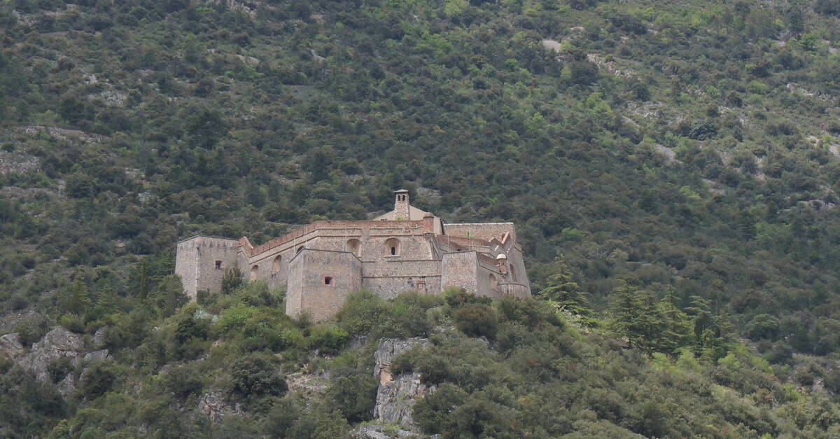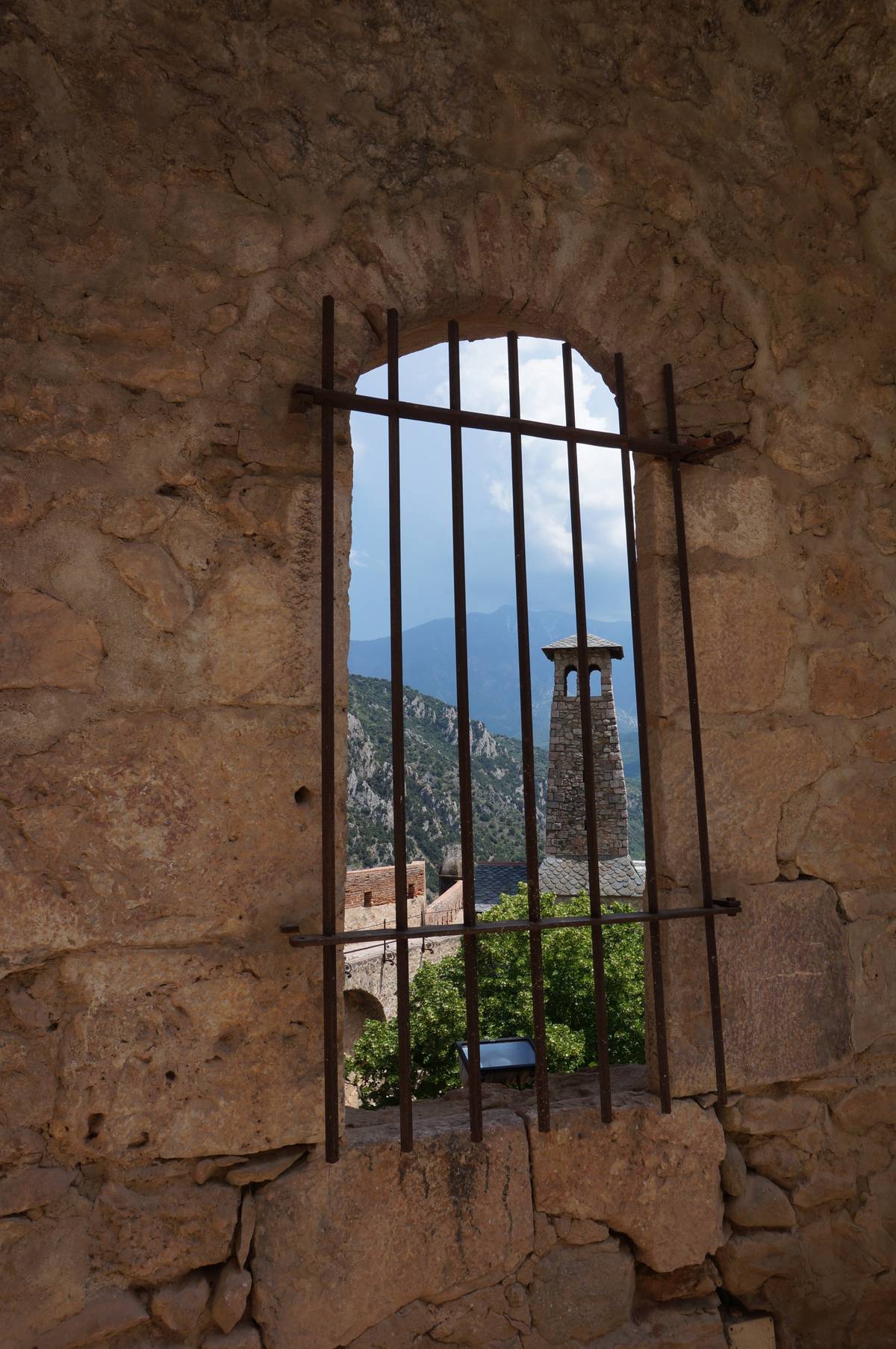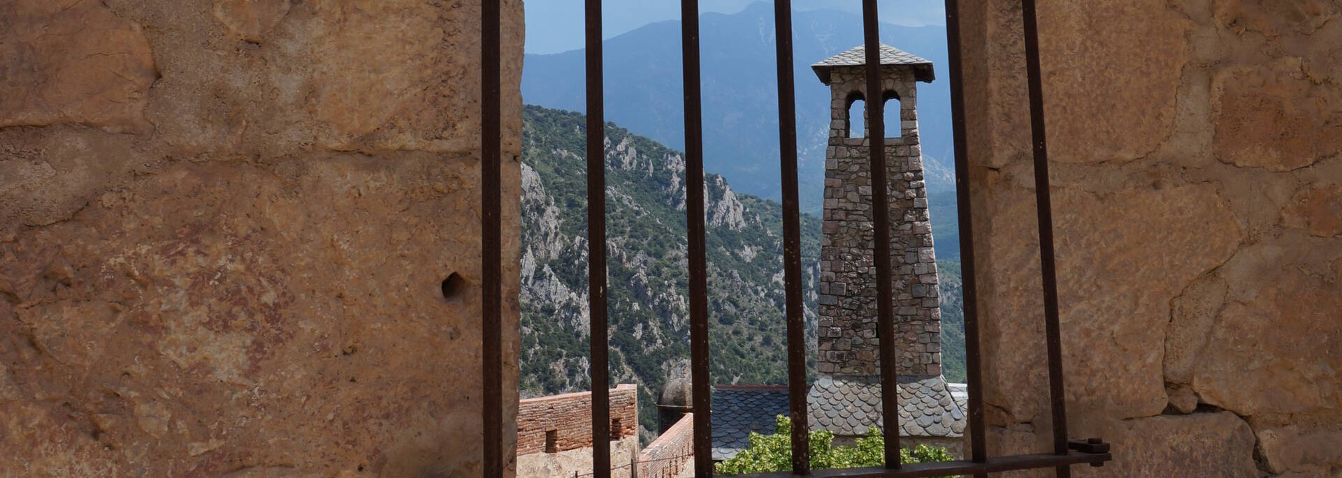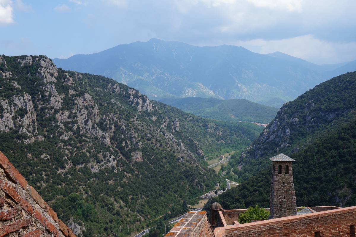 Comme beaucoup, nous comptons les marches, mais petit à petit, nous les oublions pour découvrir le paysage qui s'offre à nous à chaque palier. Le Canigó est majestueux d'ici. Nous prenons de la hauteur trés rapidement et sommes ébahies par la construction. Bien cachées et protégées par des murs d'une épaisseur incroyable, nous nous imaginons facilement soldats entrain de veiller sur notre contrée.