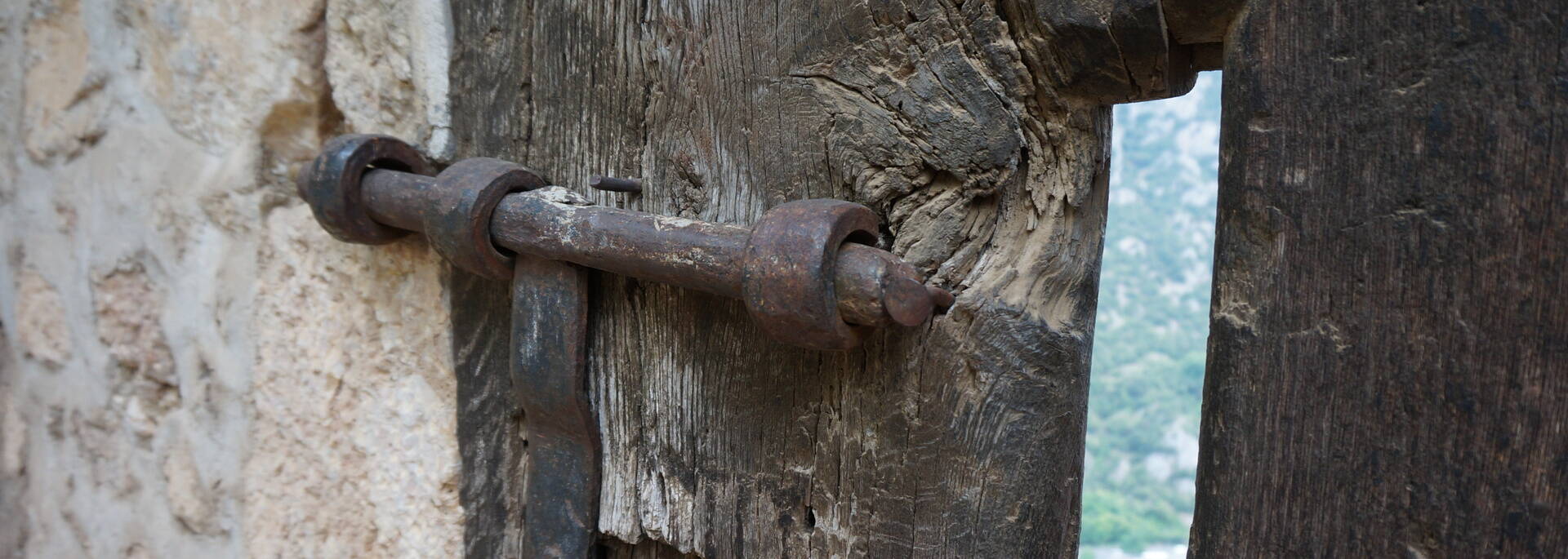 Après une bonne vingtaine de minutes de marche, nous arrivons à l'entrée du château après avoir passé une dernière porte certie du Fer du Canigou. Nos jambes chancellent.