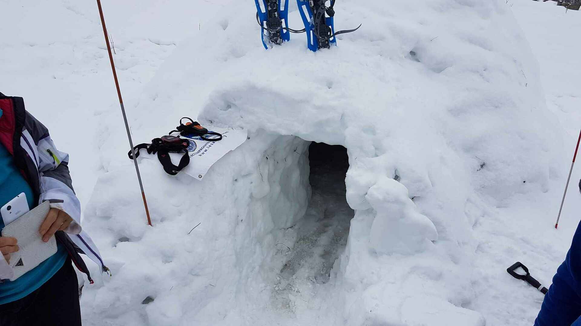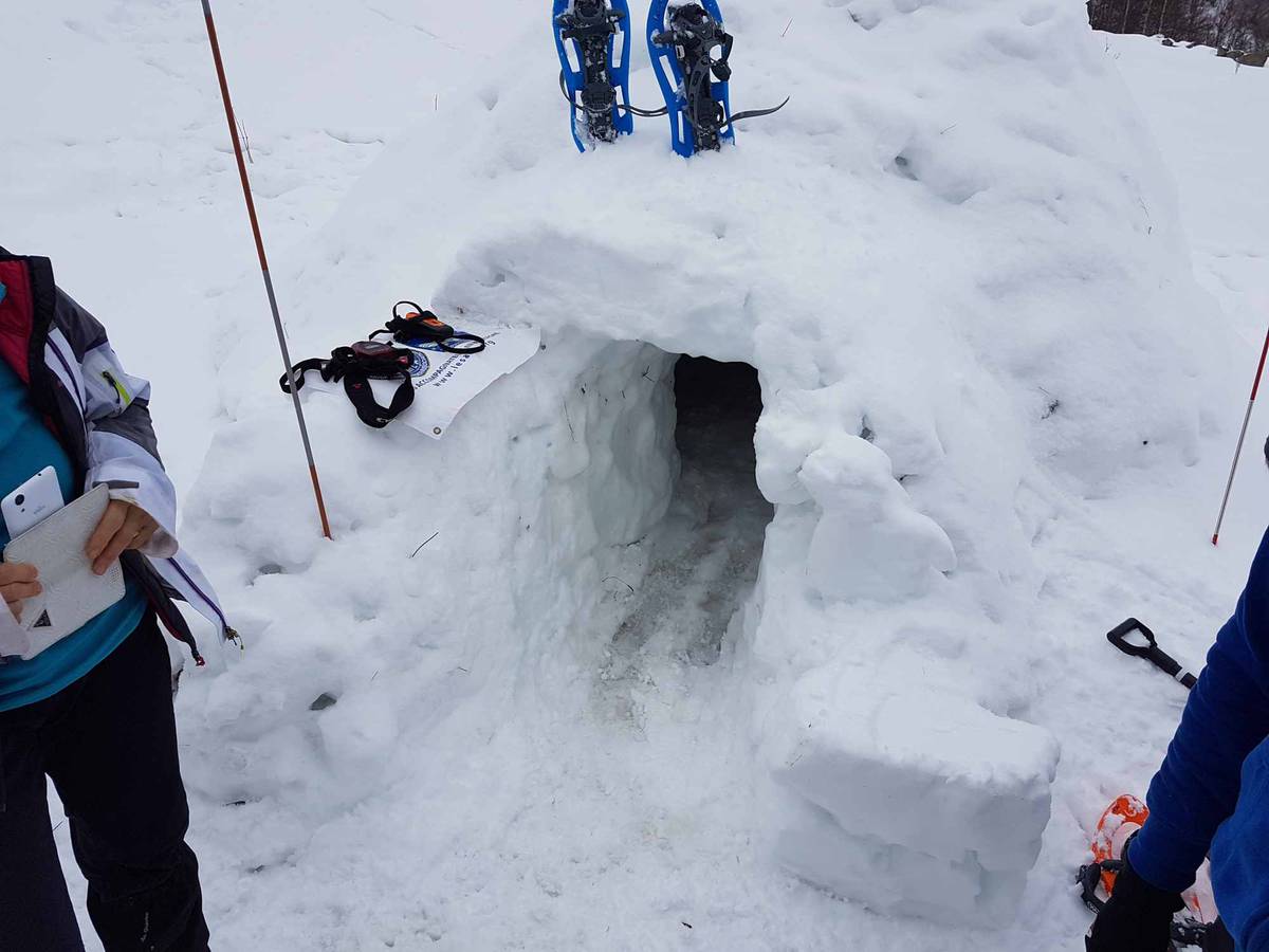 Nous passons 2 ou 3 passages un peu technique et ce qui devait arriver arriva, je me retrouve à dévaler une pente sur les fesses. Nous arrivons à la fin de la balade qui a durée tout de même 1h30 et allons voir l'igloo qui a été construit par les accompagnateurs en montagne la veille. Nous avons eu la chance de voir comment fonctionne un DVA (détecteur de victime d'avalanche) mais aussi de nous en servir.