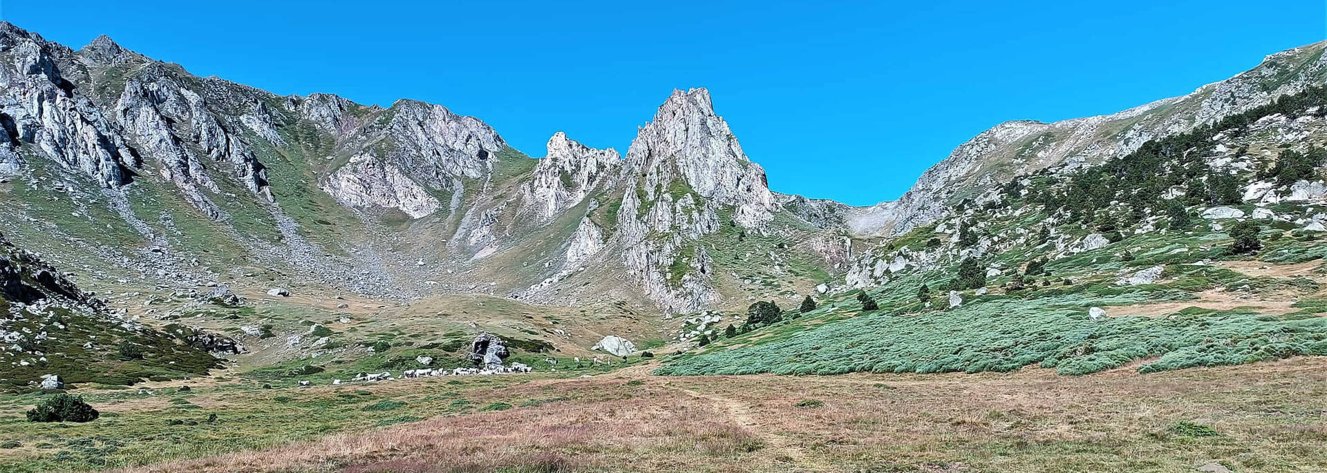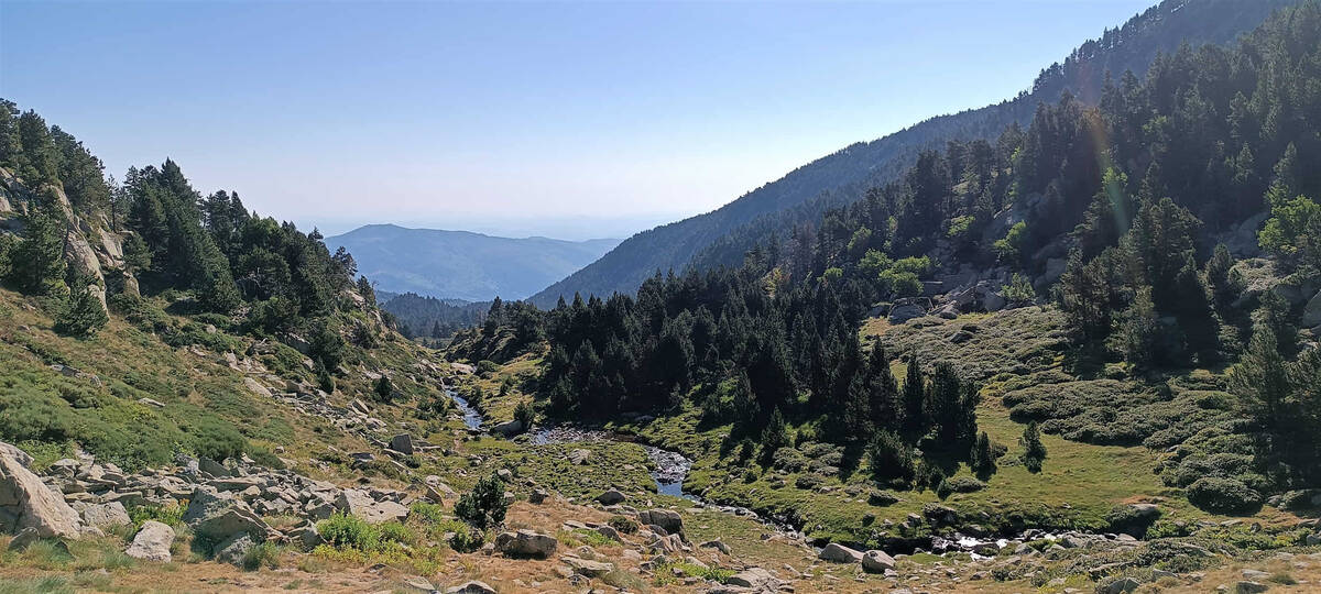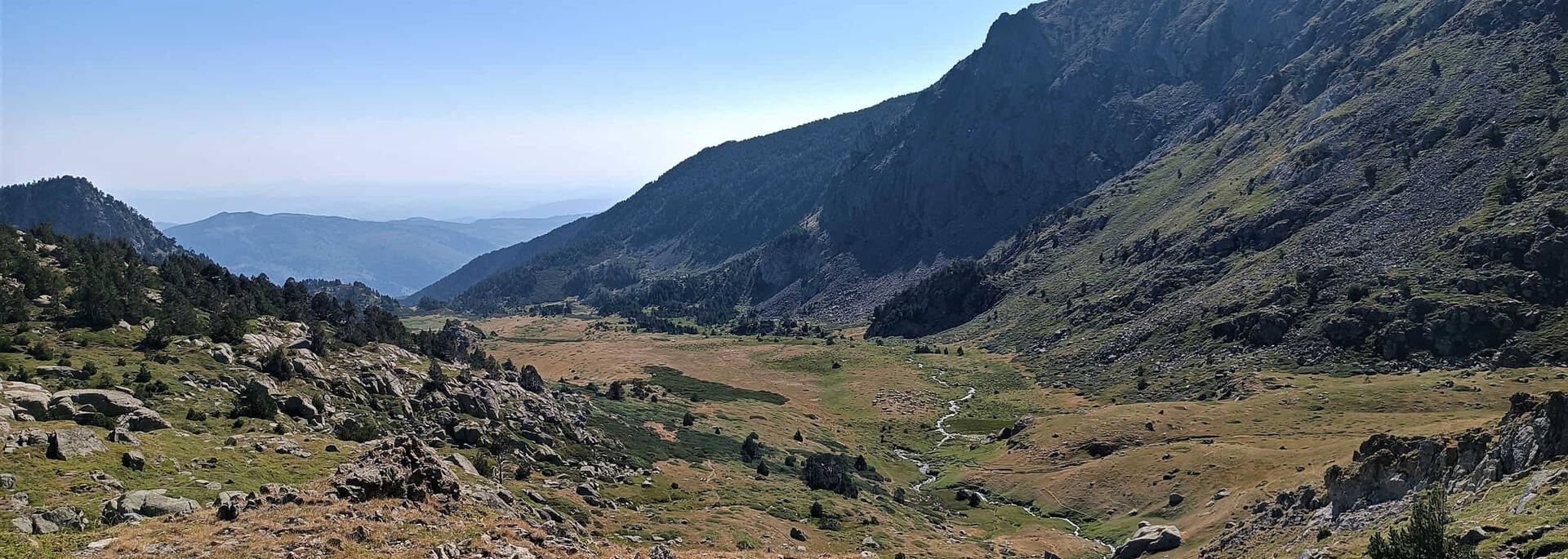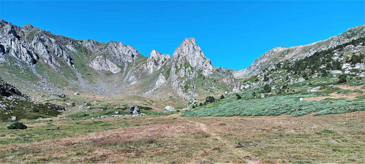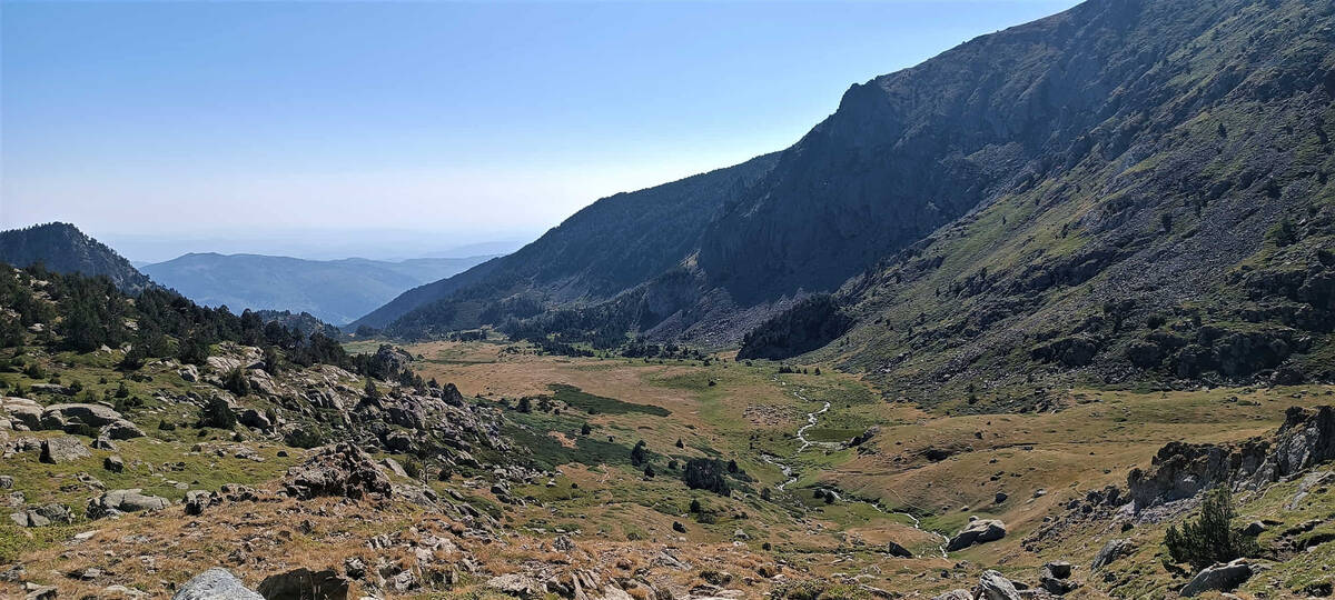 Nous passons le torrent de la Castellane. Nous en profitons pour faire une petite pause rafraichissante car il fait très chaud malgré l'altitude. Une petite montée supplémentaire avant d'atteindre la cabane de la Balmette, de là une magnifique vue s'offre à nous avec un grand plateau. Nous pouvons observer l'immense rocher appelé "Salt del Burro" et c'est aussi là que nous voyons les deux premiers isards.