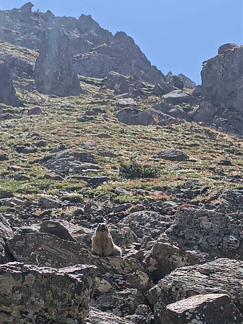 En continuant à monter en direction du pic nous entendons siffler. Il s'agit de jolies marmottes assises sur les rochers au soleil. Cette randonnée est incroyable au niveau de la faune !