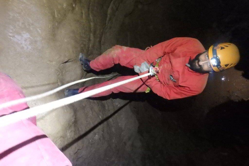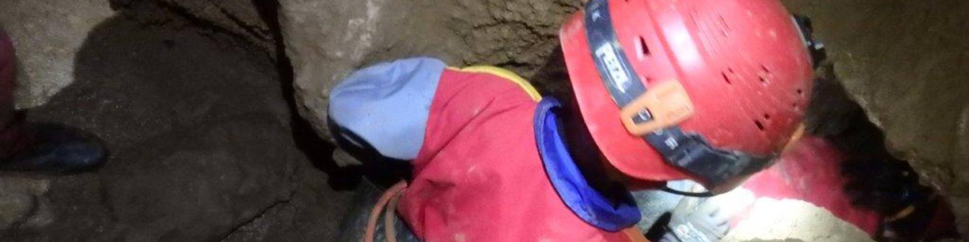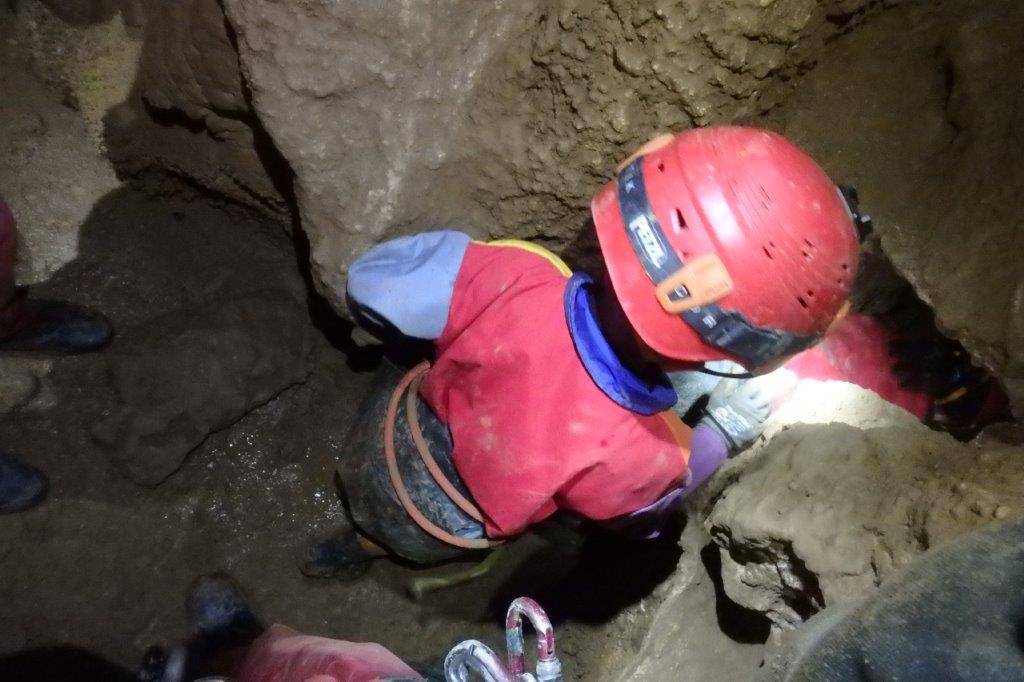 Suite à quelques petites grimpettes et courts passages en rampant, l’heure est venue de la deuxième surprise de notre moniteur : une montée de paroi avec changement de cordes, pour finir par une belle descente en rappel… les pieds dans l’eau ! D’où l’utilité des bottes !