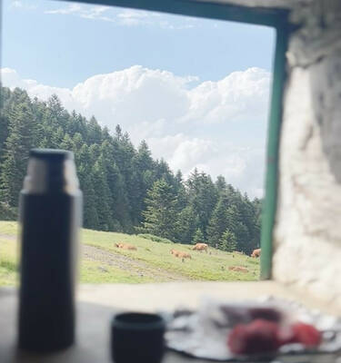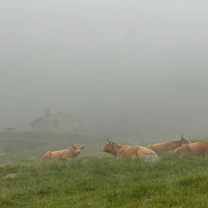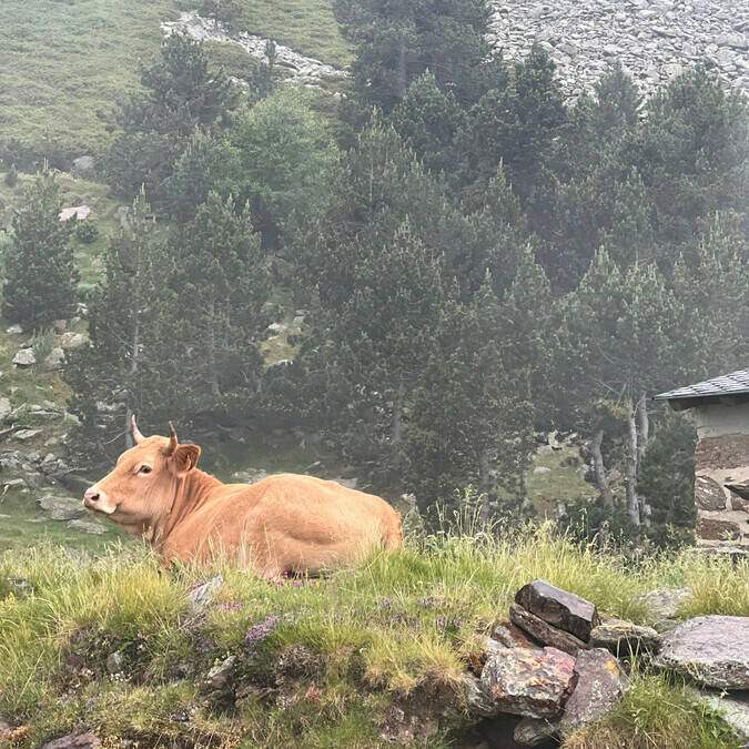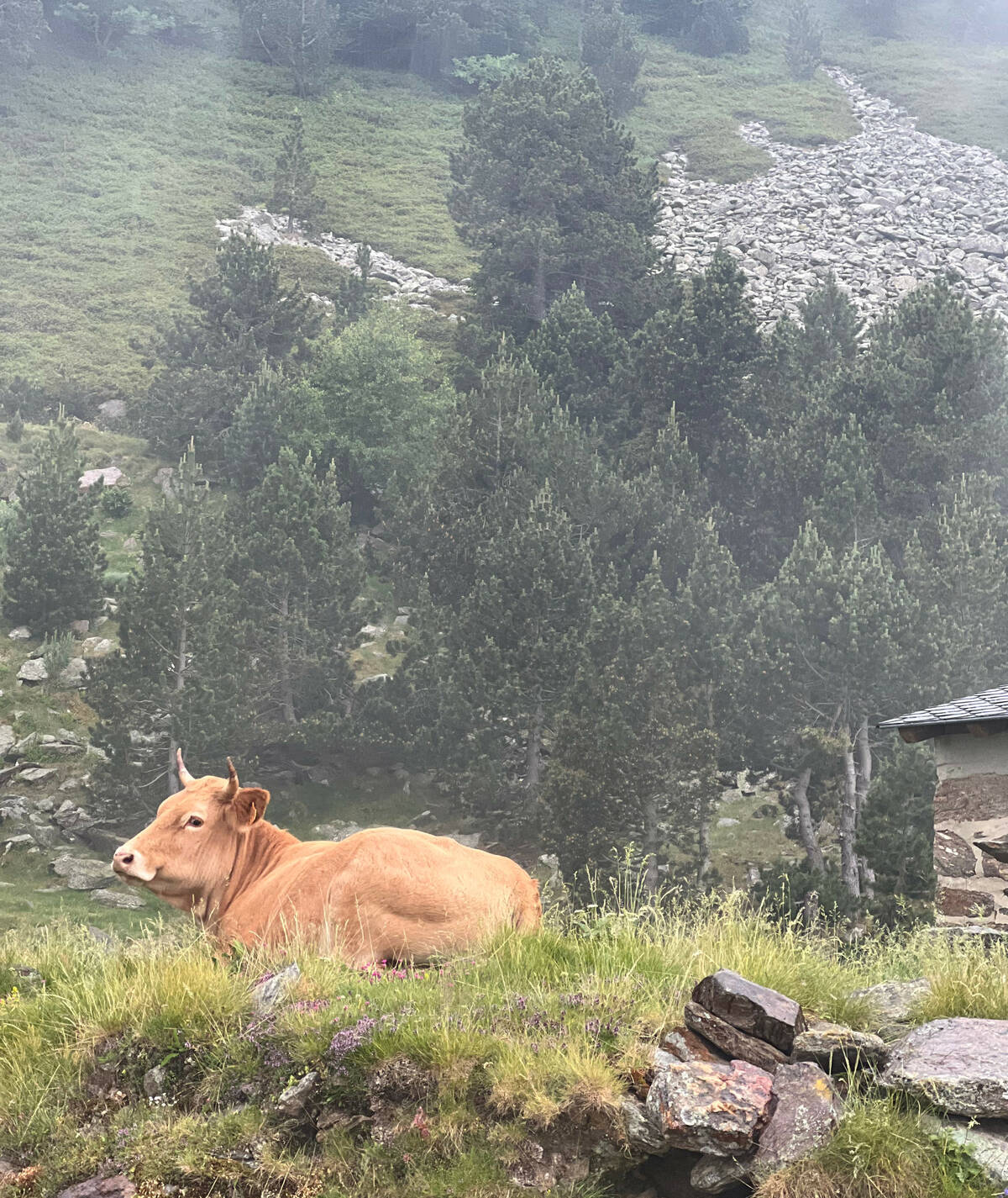 Un morceau de saucisson, un thermos rempli d’ambré de Rivesaltes et cette pause forcée n’est plus si désagréable, rajoutez à ça la vue depuis notre abri et on aurait presque tendance à rester là pour la soirée. Mais il est maintenant 18h, l’orage est passé, on se souvient de pourquoi on est là et on décide de quitter notre abri et nos nouveaux amis ruminants pour reprendre notre chemin jusqu’aux Cortalets.