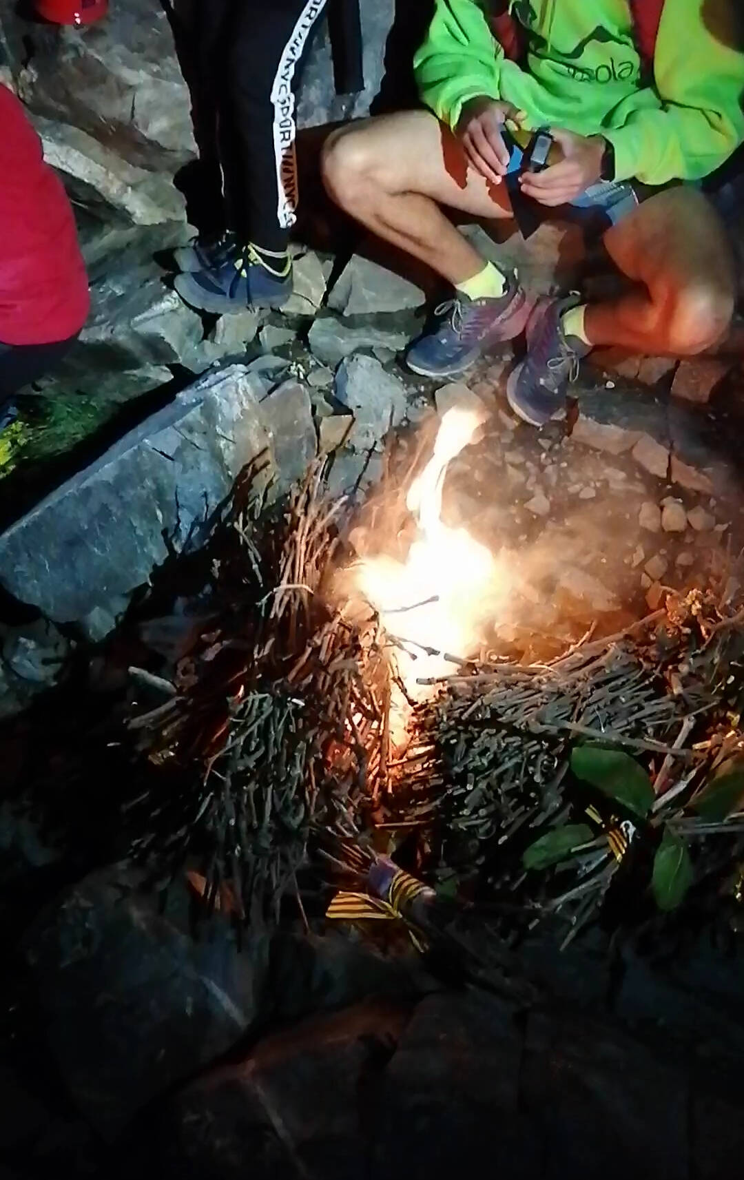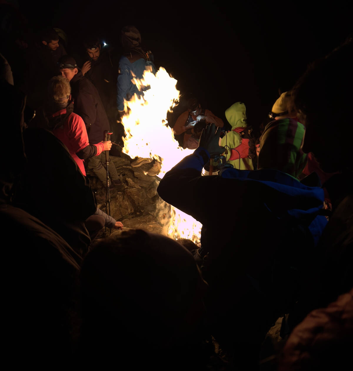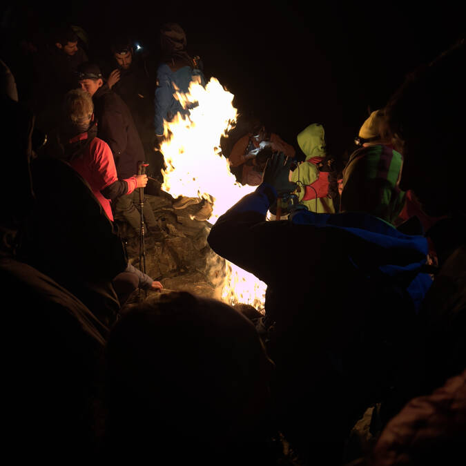 On approche de minuit et des soixante personnes sur le pic, un vrai défilé de lampes frontales ! Les derniers visiteurs sont enfin là, prenez place ça va bientôt commencer. Par chance en arrivant nous nous sommes installés juste à côté de l’endroit où la flamme allait être allumée et avons donc pu assister au spectacle du premier rang.