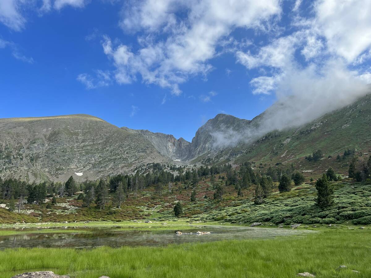 Parmi les nombreux accès pour gravir la montagne sacrée des catalans, notre choix s’est arrêté sur la piste forestière de Balaig au départ du Coll de Milleres à Fillols. Nous sommes partis en milieu d’après-midi avec pour projet une pause repas au refuge des Cortalets avant de rejoindre le pic, mais la météo en a décidé autrement. Aux alentours de 17h une grosse averse nous oblige à prendre refuge dans la jaça des Cortalets. Pris au piège avec nous par la pluie, un couple de catalans qui était là pour les mêmes raisons que nous : attendre la fin de l’orage et assister à la régénération de la flamme.