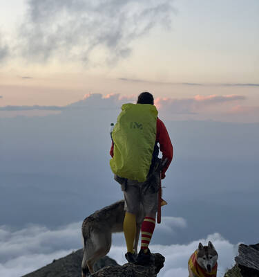 En plus d’une « golden hour » d’une rare qualité, on dispose de deux superbes modèles vêtus de leur plus beau drapeau catalan pour l’occasion. Les photographes amateurs qui sommeillent en nous ne résistent pas. On s’arrête quelques instants pour immortaliser le moment et profiter de la vue, quitte à finir les derniers mètres de notre ascension de nuit.