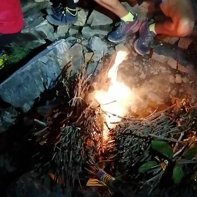 Après un long et beau discours des trois « montagnards » qui ont monté la flamme et quelques airs catalans chantés en chœur on comprend vite l’intensité du moment qu’on est en train de vivre. Pas besoin d’être bilingue pour profiter de la magie qu’il y a à cet instant sur le pic de la montagne sacrée. Il y a de tout et de tous les horizons ce soir sur le pic, des jeunes et des moins jeunes, des français, des catalans et même deux petits loups. Tout le monde est au rendez-vous pour partager cette expérience unique à vivre au moins une fois dans sa vie. Il ne fait pas chaud ce soir-là au Canigó, mais l’atmosphère et les cœurs sont vite réchauffés par les chants, la bonne humeur et la flamme mythique qui s’embrase maintenant au sommet de la montagne.