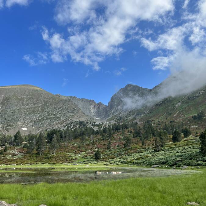 Après avoir partagé avec eux une bière au refuge et s’être donné rendez-vous à minuit au pic, on quitte le refuge pour partir s’installer tout prêt d’ici, devant l’étang de l’Estanyol pour profiter du cadre et du repas qu’on attend maintenant (surtout moi) depuis des heures.