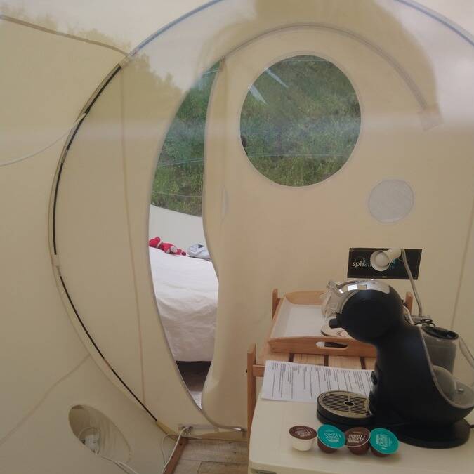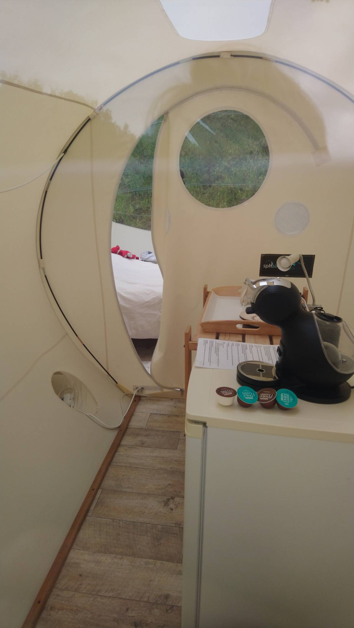Elle nous explique ensuite le principe de la bulle. Nous devons déjà rentrer dans un sas, dans lequel se trouve un petit frigo, une machine à café et tout le nécessaire pour le petit déjeuner pour le lendemain. Avant d’accéder à la partie nuit, il faut que le sas soit refermé pour que l’air soufflé reste à l’intérieur. Une habitude facile à prendre.