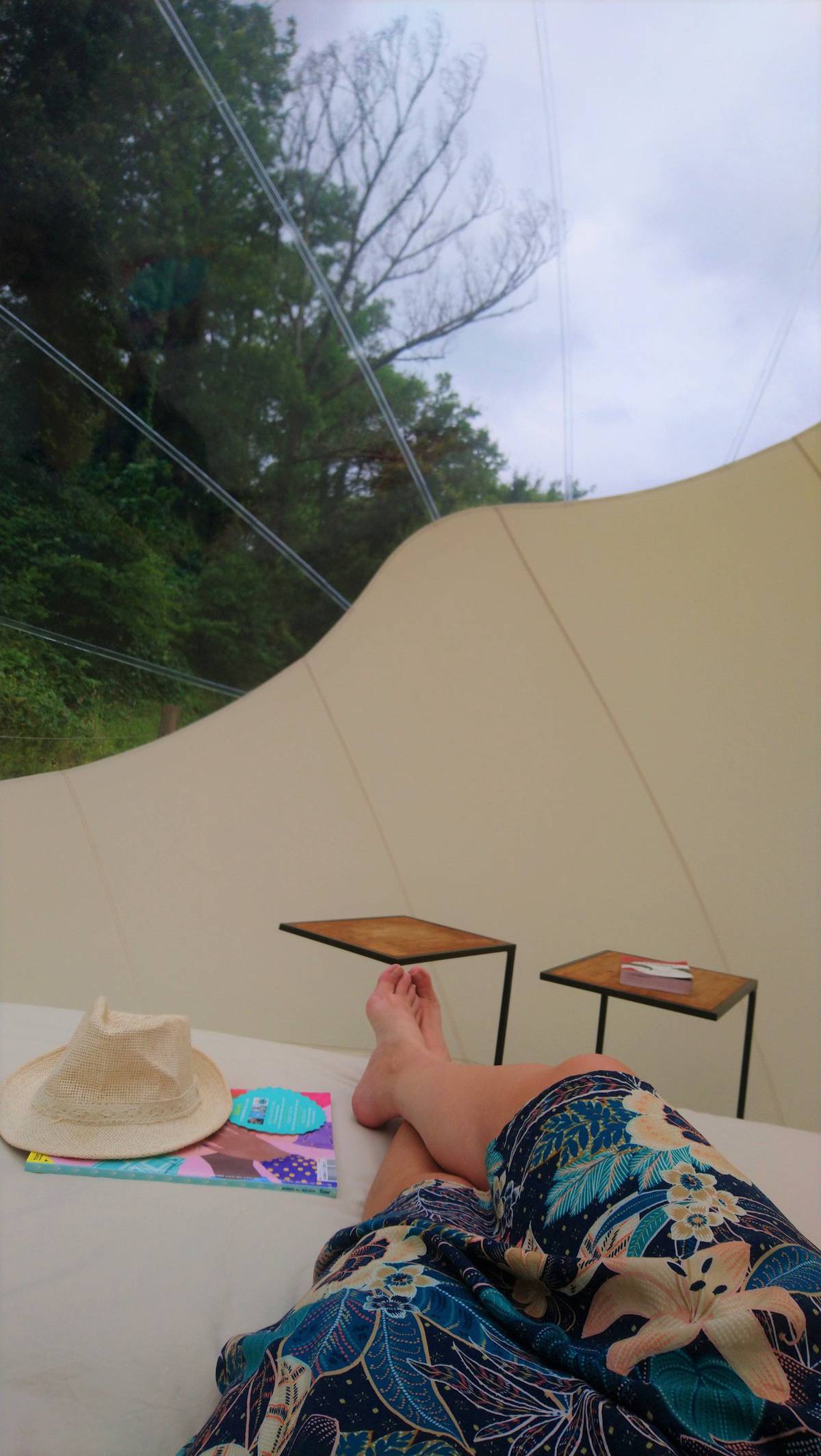 Nous découvrons ensuite l’intérieur de la bulle. C’est superbe ! Je lève de suite la tête pour essayer de me rendre compte de la vue une fois la nuit tombée. Un arbre tout en hauteur, majestueux va veiller sur nous et nous faire quelques coucous. La bulle est en grande majorité transparente (une partie permet d’être toutefois en intimité, elle est également orientée pour ne pas être surpris par des regards indiscrets).