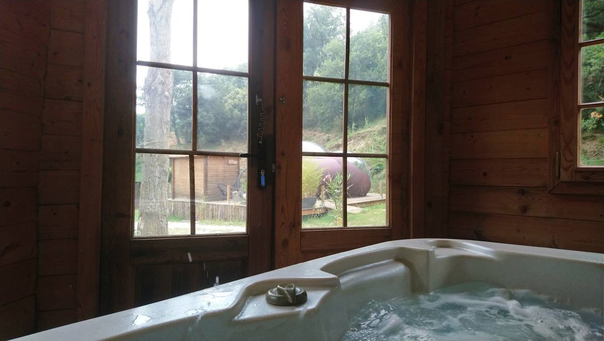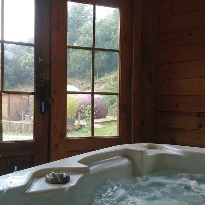 Avant le plateau tapas qu’Isabelle va préparer et nous amener vers 19h30, nous avons un peu de temps libre. Nous décidons d’aller déjà faire un plouf dans le lac de Vinça, depuis la plage privative du camping, avant de profiter du jacuzzi, réservés aux clients des bulles. Ce jour, nous sommes les seules. Chance pour nous.Durant la visite, Isabelle nous a expliqué son fonctionnement et donné quelques recommandations.