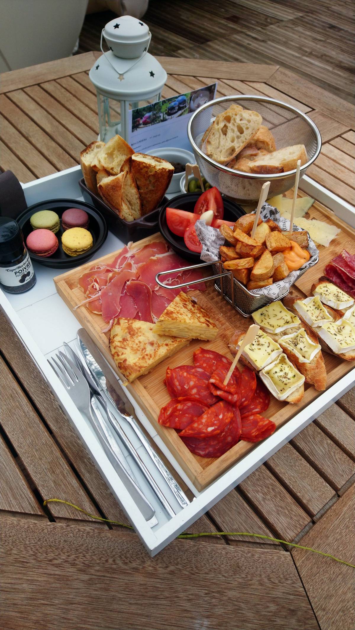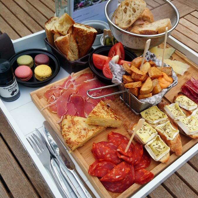 Isabelle arrive THE plateau de tapas !!!! Waouh, qu’est ce qu’il est copieux. Nous décidons de le manger à l’intérieur de la bulle, car le vent s’est invité et le soleil joue à cache-cache. Avant de prendre congés, Isabelle nous souhaite une bonne soirée et nous invite à retourner au jacuzzi après le repas.