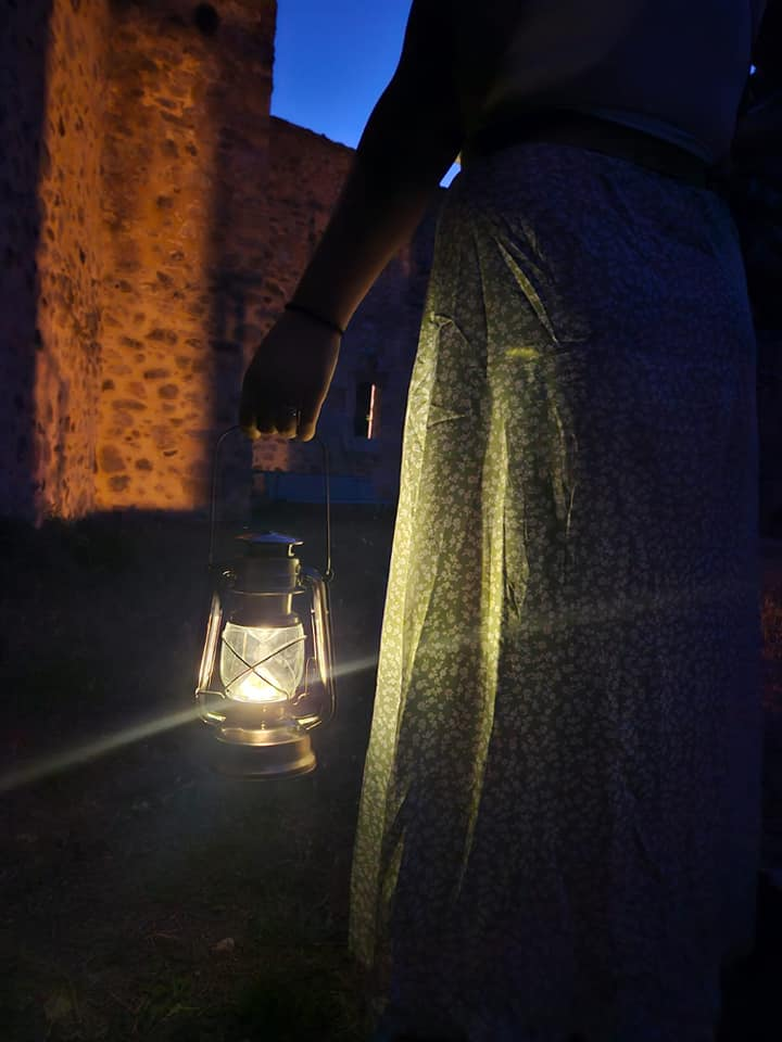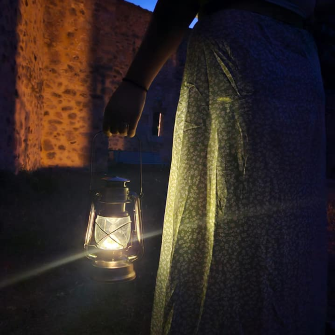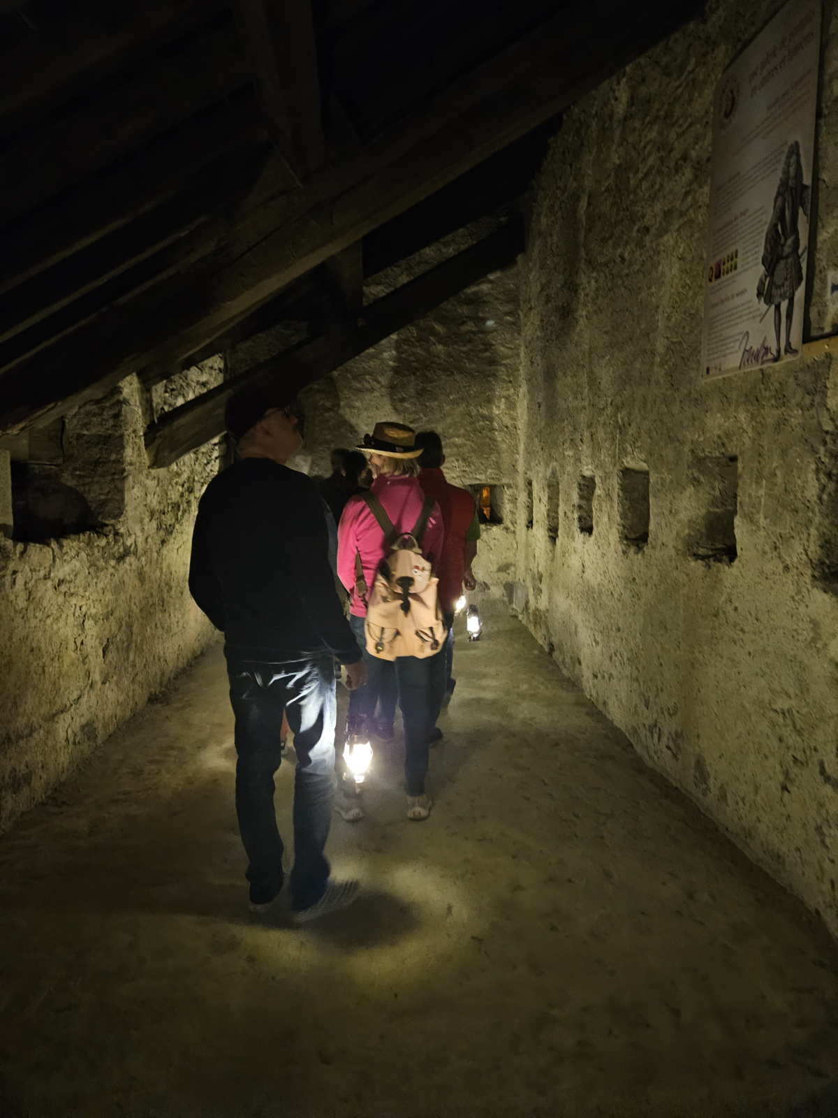 Nous passons désormais par le chemin de Ronde. Une cinquantaine de personnes s’apprête désormais à rentrer dans les remparts, les murailles qui entourent la ville. Si de jour, c’est une visite déjà très intéressante de nuit c’est encore plus intense.Répartition des lanternes. Il n’y en a pas assez pour tout le monde alors le mieux est de créer une chaine de luminions pour que tout le monde puisse se repérer facilement. Ne vous inquiètez pas, il y a des roulements alors tout le monde aura le droit de tenir la lanterne.