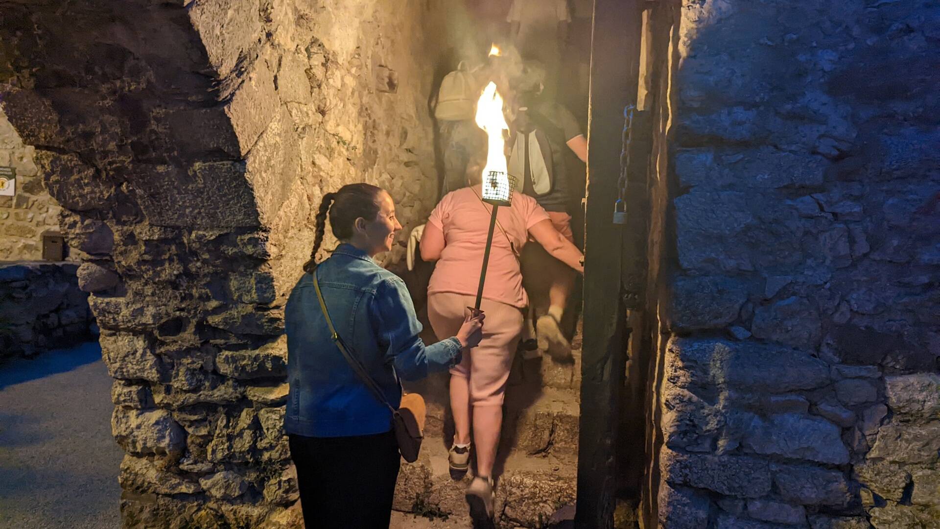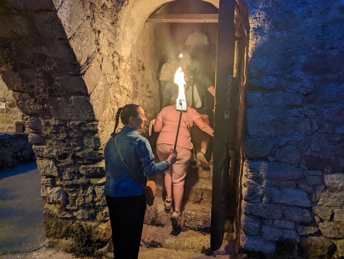 Nous passons désormais par le chemin de Ronde. Une cinquantaine de personnes s’apprête désormais à rentrer dans les remparts, les murailles qui entourent la ville. Si de jour, c’est une visite déjà très intéressante de nuit c’est encore plus intense.Répartition des lanternes. Il n’y en a pas assez pour tout le monde alors le mieux est de créer une chaine de luminions pour que tout le monde puisse se repérer facilement. Ne vous inquiètez pas, il y a des roulements alors tout le monde aura le droit de tenir la lanterne.