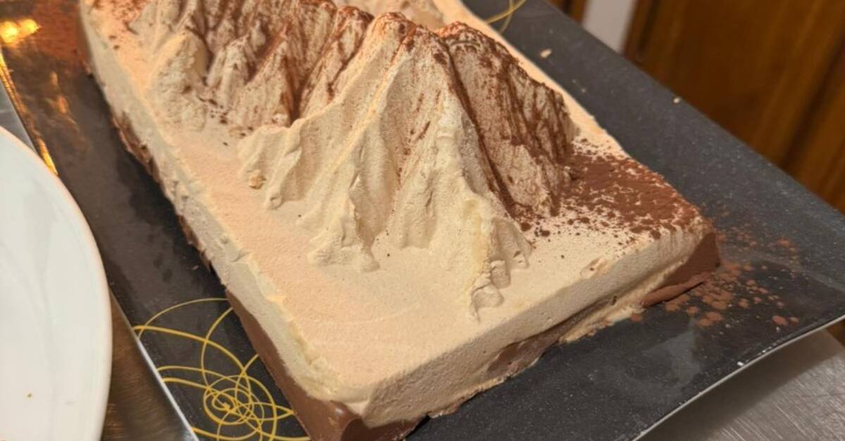 Sous sa silhouette inspirée du Canigó, se cachent une ganache montée onctueuse au chocolat lait-caramel, une ganache intense au chocolat noir, et un moelleux biscuit quatre-quarts.