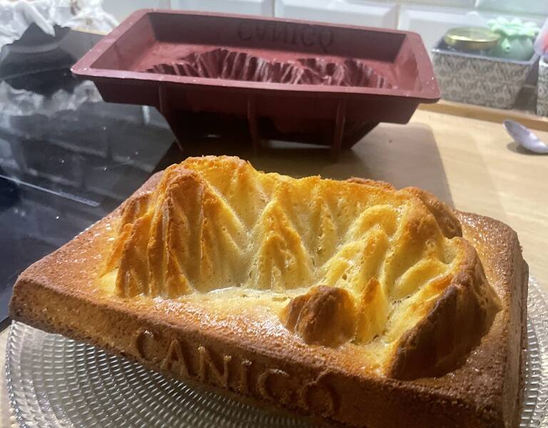 Mon compagnon m'a rapporté le moule à gâteau du Canigó, en revenant des Pyrénées-Orientales (pièce n° 173/400, emballée avec amour par Kateleen). Quelle magnifique surprise ! Je m'en suis servi ce week-end, en faisant un simple gâteau au yaourt recouvert de chocolat. C'est un premier essai, je réaliserais d'autres recettes, salées notamment... Le démoulage est très facile. Merci beaucoup. Quelle bonne idée de mettre ainsi en valeur cette belle montagne sacrée des Catalans ! Bravo pour cette belle initiative !
