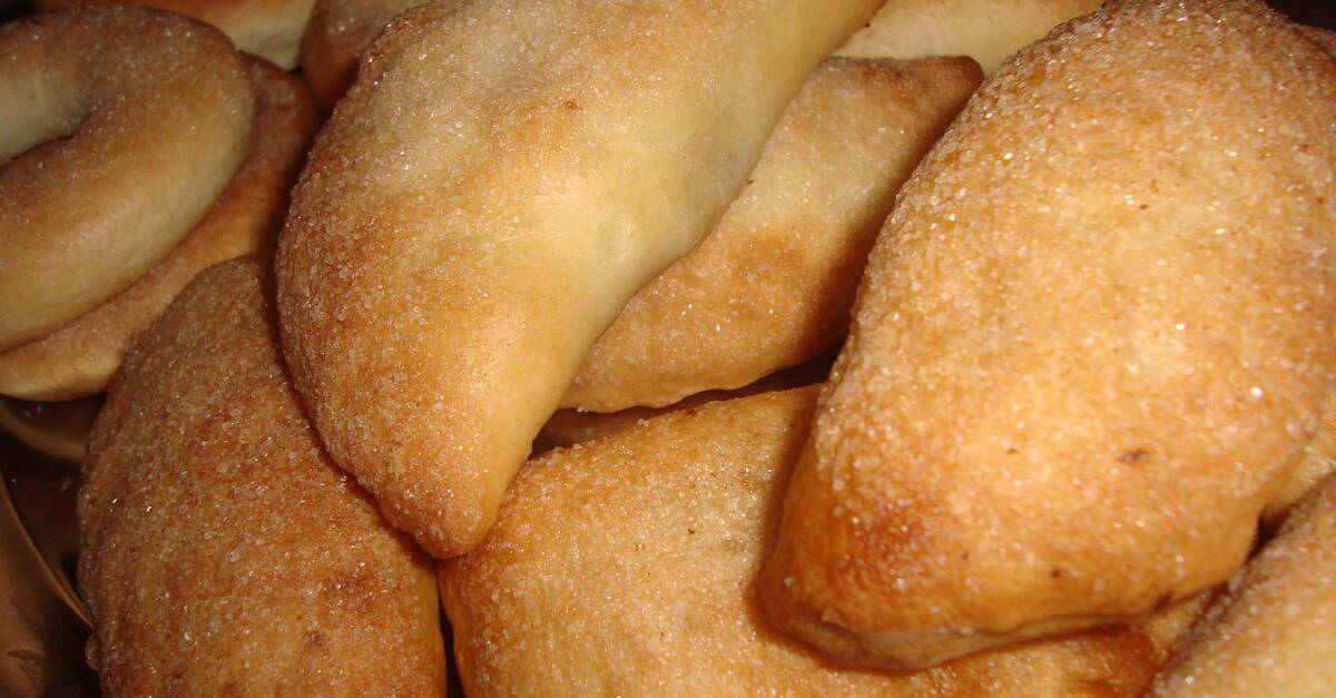 - Pour la pâte : Mélanger l’huile, la farine, le sucre et l’eau-de-vie et pétrir le tout jusqu’à l’obtention d’une pâte consistante. Aplatir la pâte à l’aide d’un rouleau et former des petits cercles de 1 à 10 cm de diamètre. Aplatir chaque cercle à la main et fourrer d’une cuillère de la farce. Refermer comme s’il s’agissait d’un chausson et faites pression sur les bords.